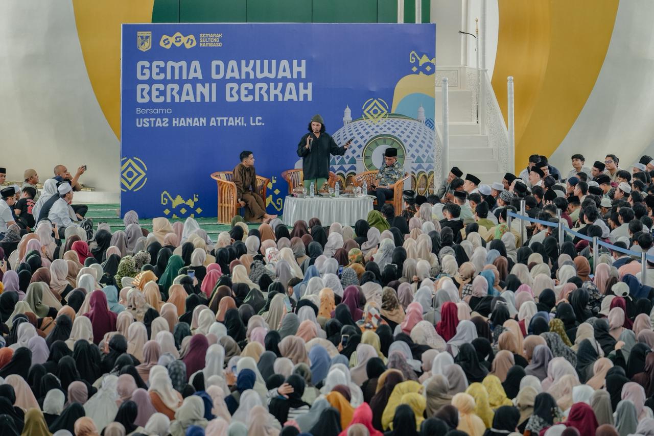 Palu, Caralain.id – Ribuan masyarakat memadati Masjid Raya Baitulkhairaat, Kota Palu, Sulawesi Tengah, Rabu sore (15/4/2026). Kehadiran mereka untuk mengikuti tausiyah pendakwah nasional Hanan Attaki dalam acara bertajuk “Gema Dakwah Berani Berkah” yang menjadi bagian dari rangkaian Hari Ulang Tahun ke-62 Provinsi Sulawesi Tengah.
